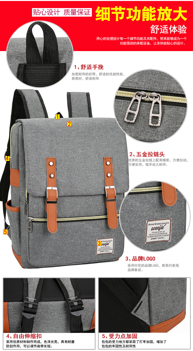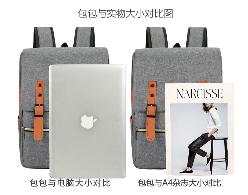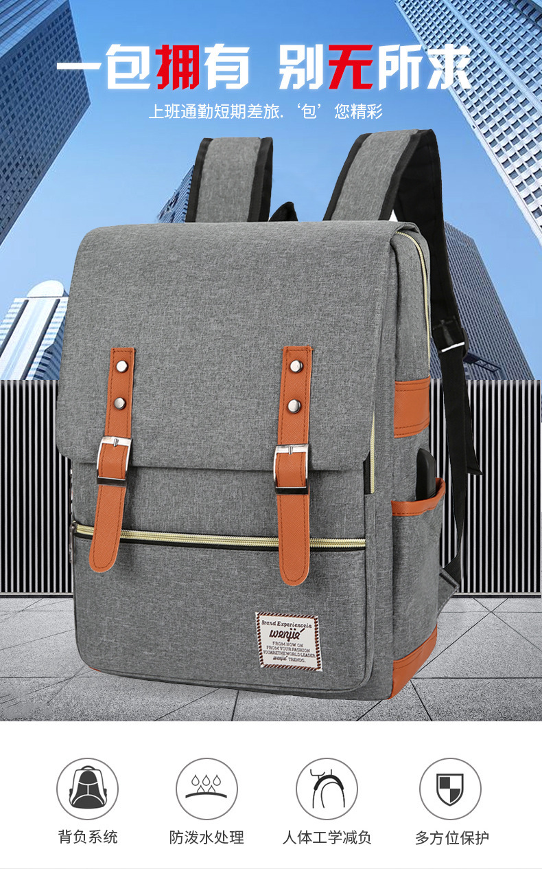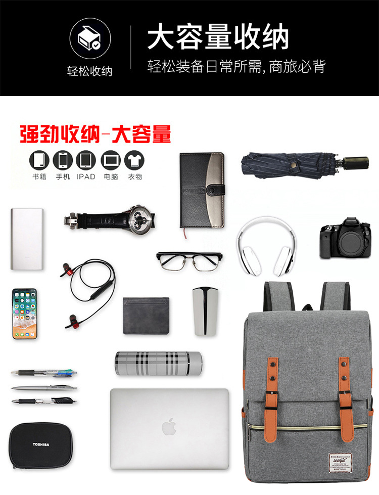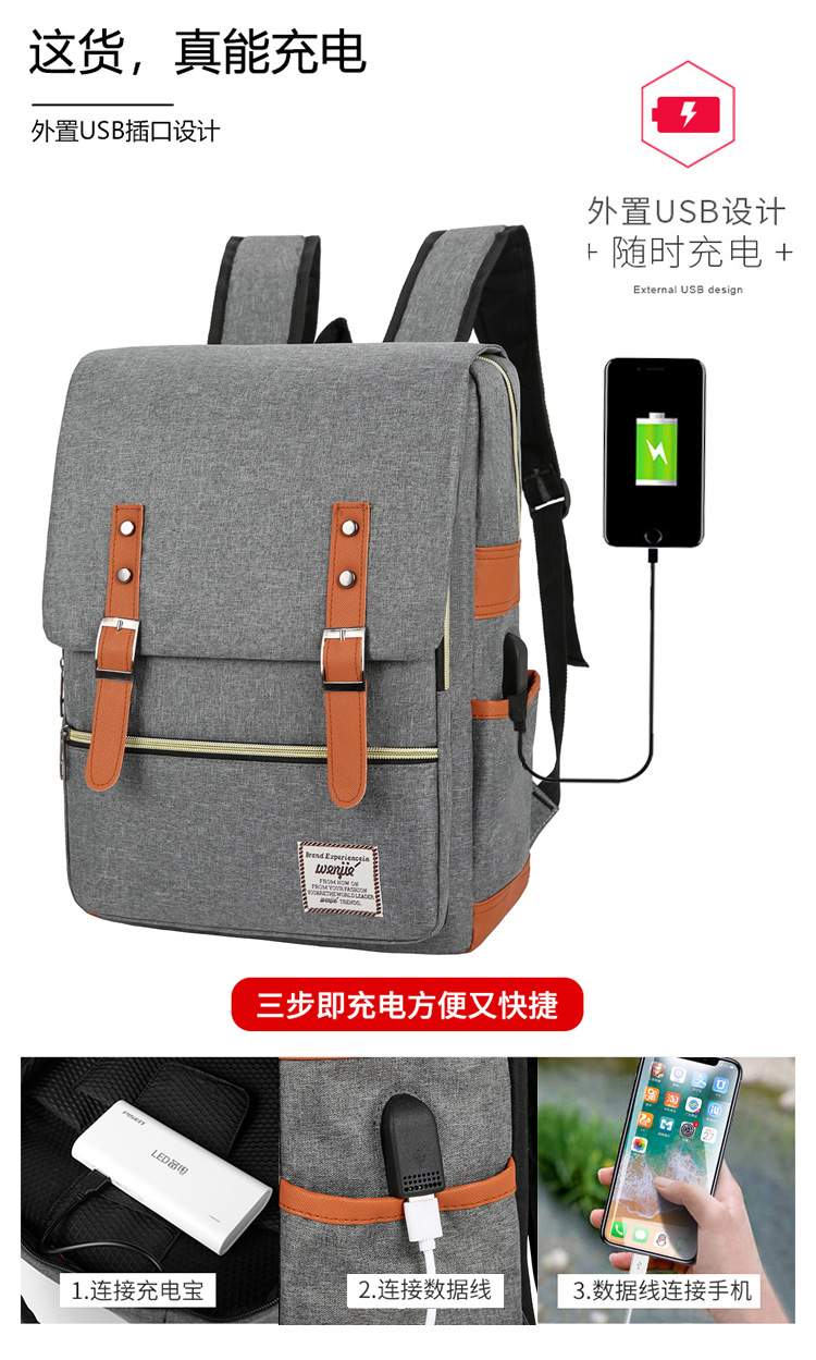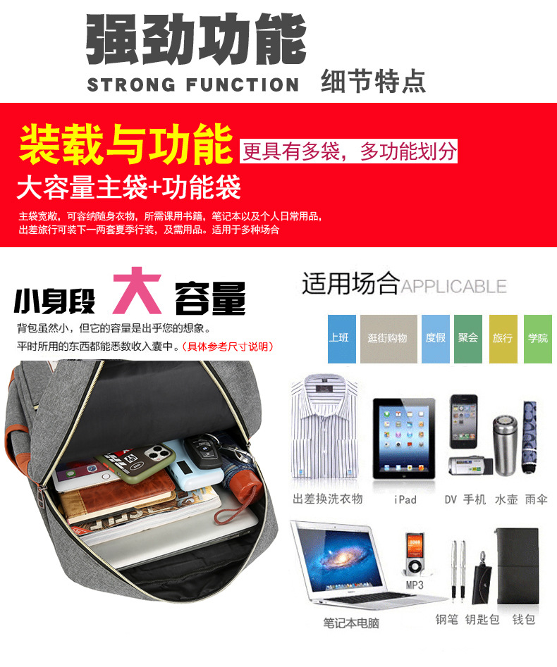 USB interface design large capacity backpack Design: USB interface design Size: Big bag: height/width/thickness: 43*28*14cm Material: Oxford cloth Lining: Polyester Weight: 0.52kg Color: black, red, gray, dark blue