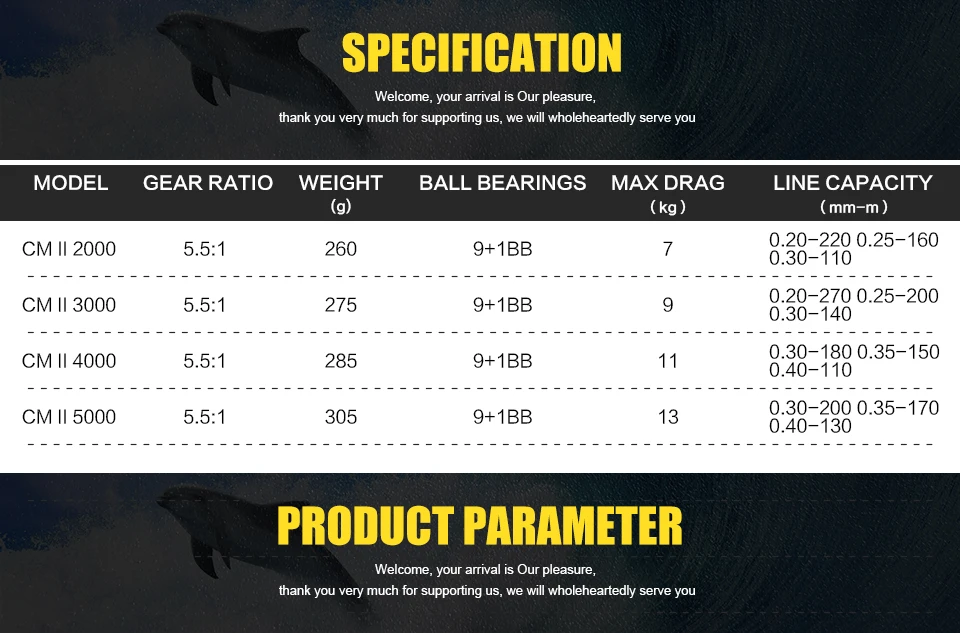 CM II 5000 | Weight: 305g | Max Drag: 13.0KG | Gear Ratio: 5.5:1 | Line Capacity:0.30mm-200M, 0.35mm-170M,0.40mm-130